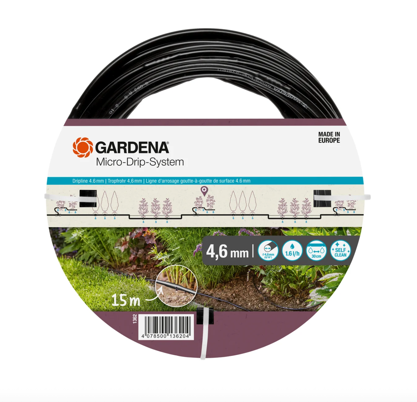 Das GARDENA Micro-Drip-System Tropfrohr bietet präzise Bewässerung für Sträucher, Blumenbeete und Gemüsereihen. Mit integrierten Tropfern alle 30 cm liefert jeder Punkt konstant 1,6 Liter Wasser pro Stunde – ideal für gleichmäßige Pflanzenversorgung bei minimalem Wasserverbrauch. Die selbstreinigenden Tropfer mit Labyrinth-Technik verstopfen nicht und ermöglichen wartungsfreien Betrieb. Das 15 m lange Rohr lässt sich einfach verlegen und mit separat erhältlichen Rohrhaltern fixieren. Erweiterbar auf bis zu 30 m für größere Flächen. Perfekt kombinierbar mit dem GARDENA Tropfbewässerungs-Set Gemüse/Pflanzreihen.